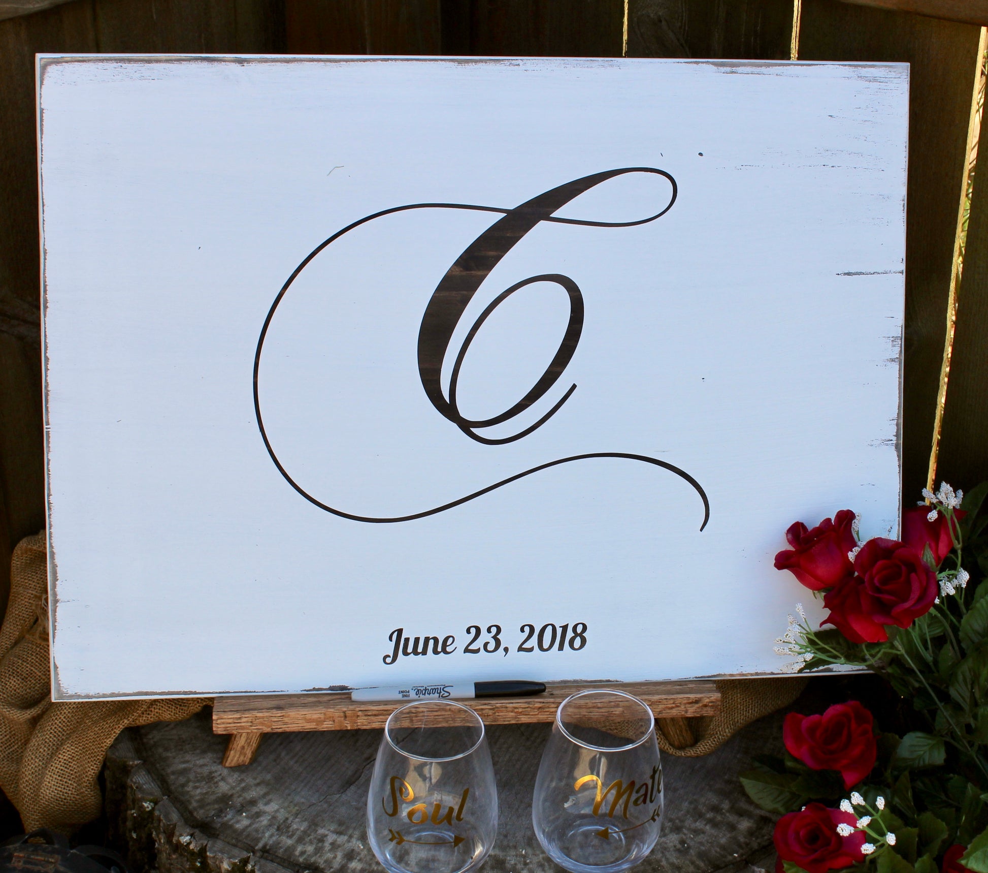 Made from solid wood, measures 16 inches by 24 inches. White distressed background with cursive letter and date in wood grain brown. Background is distressed white paint. The sign will come with a hanger on the back for quick and easy display in your home.